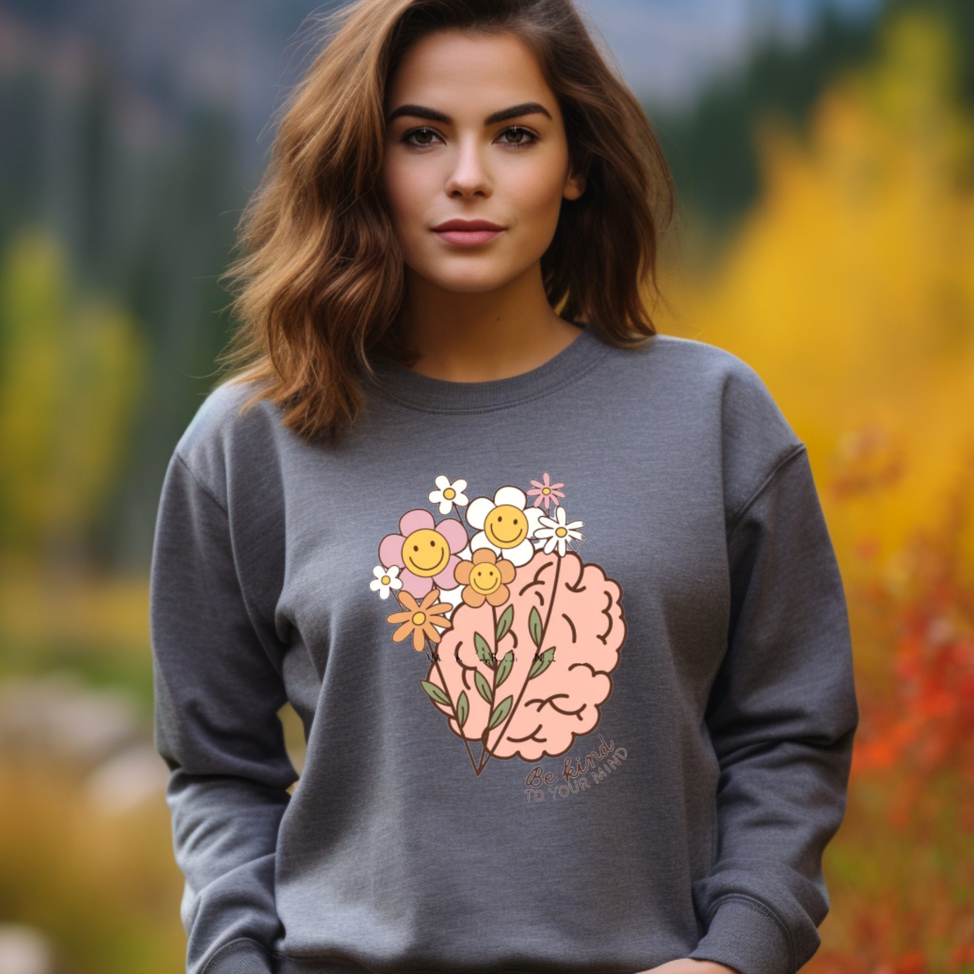Elevate your casual cool mom style while spreading a message of compassion with our “Be Kind to Your Mind” Graphic Crewneck Sweatshirt. Crafted with comfort and mindfulness in mind, this sweatshirt serves as a gentle reminder to prioritize your mental health and extend kindness to yourself and others. With its chic design and cozy fit, it’s the perfect piece for embracing self-care and spreading positivity wherever you go. Whether you’re running errands, enjoying a coffee date, or simply relaxing at home, let this empowering graphic inspire you to nurture your mind and cultivate a life filled with love and kindness.
