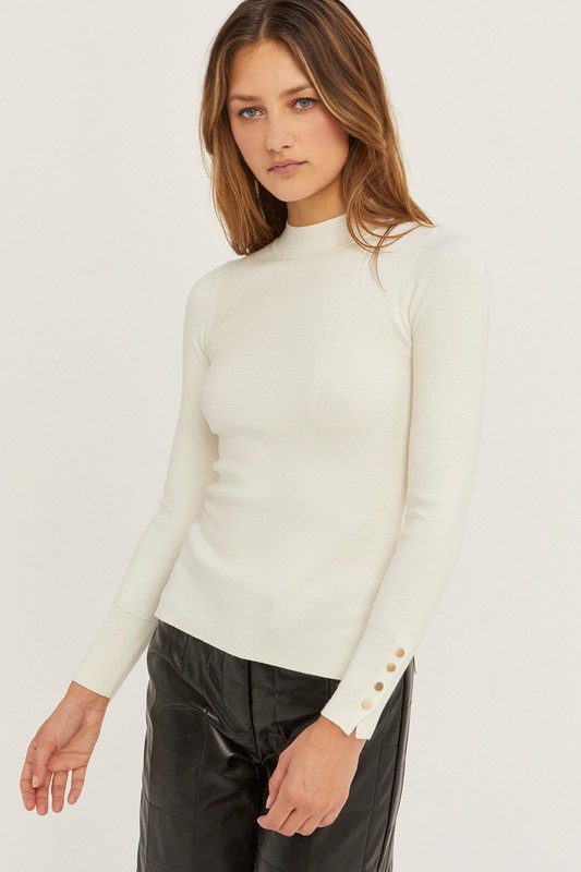 The Ivy Ivory Knit Top is a versatile and stylish addition to any wardrobe. The slim fit style and high crew neck create a sleek and sophisticated look, while the long sleeves with snap button detail add a touch of edginess. The slit detail on the side seam adds a subtle touch of femininity, and the stretchy and comfortable fabric ensures all-day comfort.