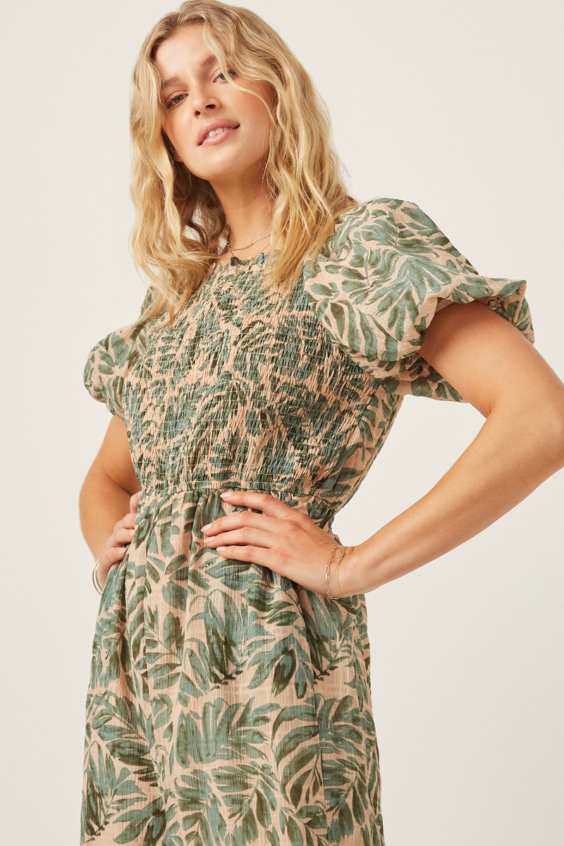 This tropical leaf print jumpsuit is perfect for those warm summer days. Made from floral woven fabric, it features a square cut neckline and smocked puff sleeves for a trendy and feminine look. The jumpsuit also comes with a dress lining for added comfort and coverage.